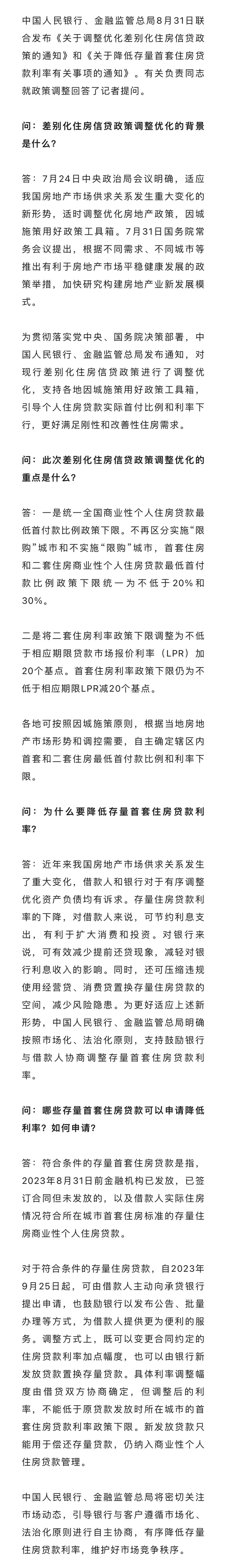 8月31日晚间,央行和国家金融监管总局联合发布《关于调整优化差别化住房信贷政策的通知》,将首套房商业贷款最低比例首付调整为20%,二套房商贷首付比例统一为不低于30%;同时二套房商业贷款利率下限调整为不低于相应期限贷款市场报价利率上浮20个基点。