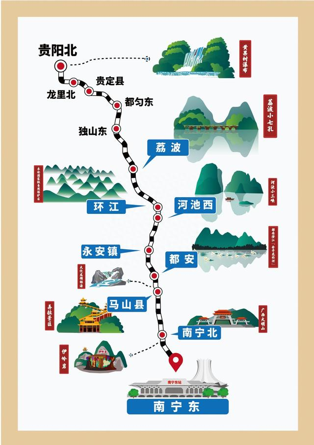 新建贵南高铁正线全长482公里,其中广西段282公里,设环江、河池西、永安镇、都安、马山县、南宁北、南宁东7座车站,其中南宁东站为既有车站,其余均为新建车站。随着贵南高铁全线开通运营,广西河池市结束了不通高铁的历史。至此,广西14个设区市全面实现“市市通高铁动车”,广西区内高铁营业里程达2174公里。