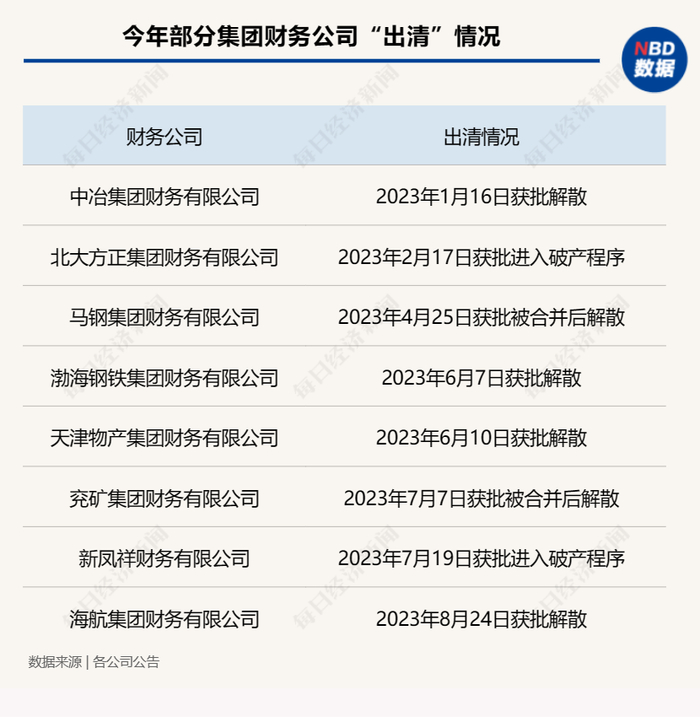 今年1月16日,中冶集团财务有限公司获批解散;2月17日,北大方正集团财务有限公司获批进入破产程序;4月25日,监管部门同意宝武集团财务有限责任公司吸收合并马钢集团财务有限公司并设立马鞍山分公司,吸收合并完成后,马钢集团财务有限公司解散;6月7日,渤海钢铁集团财务有限公司获批解散;6月10日,天津物产集团财务有限公司获批解散;7月7日,监管部门同意山东能源集团财务有限公司吸收合并兖矿集团财务有限公司,吸收合并完成后,兖矿集团财务有限公司解散;7月19日,新凤祥财务有限公司获批进入破产程序。