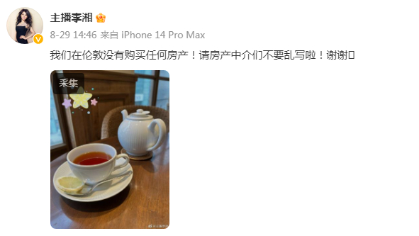 8月29日,主持人李湘在个人社交平台发文辟谣:“我们没有在伦敦买任何房产!请不要乱写啦!”