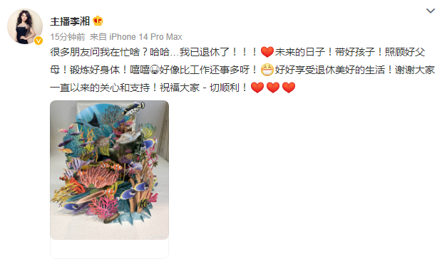 今(31)日李湘发文称,“很多朋友问我在忙啥?哈哈……我已退休了!!!未来的日子!带好孩子!照顾好父母!锻炼好身体!嘻嘻,好像比工作还事多呀!好好享受退休美好的生活!谢谢大家一直以来的关心和支持!祝福大家-切顺利!”