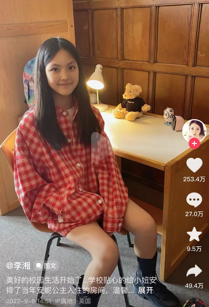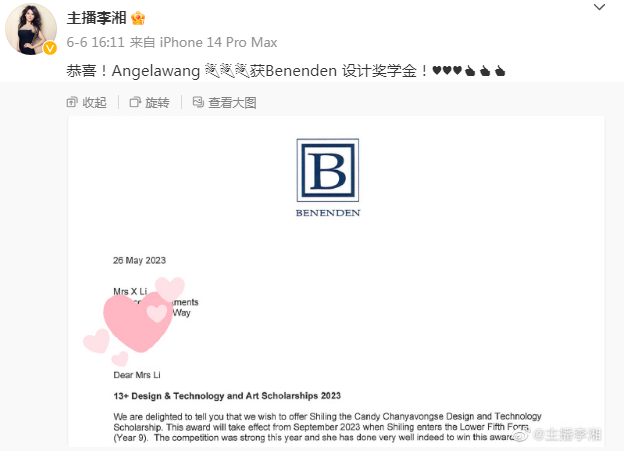 2023年6月6日,李湘在社交平台上分享了王诗龄获得该校设计奖学金的喜讯。