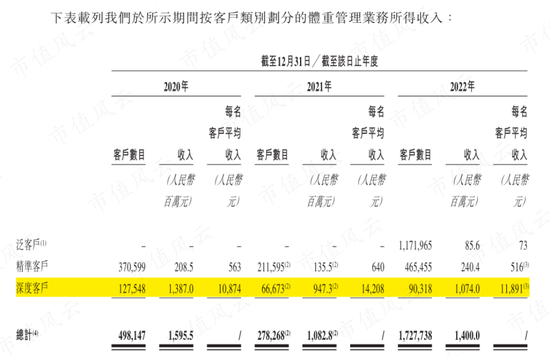 2022年,公司深度客户为9.0万名,占同期体重管理客户总数17.3万名的5.2%,却贡献了该业务76%的营收,并占到公司总营收的44%。