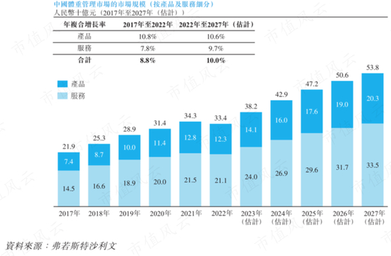 2022年,国内体重管理市场规模为334亿元,预计接下来5年以10%的CAGR(年均复合增长率)增长,于2027年达到538亿元。