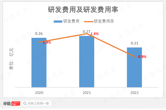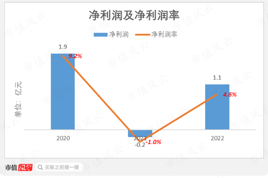 2021年,由于营收大幅下滑,高昂的销售费用率使得净利润转正为负,由上年同期的1.9亿元跌至-0.2亿元,当期净利润率为-1.0%。