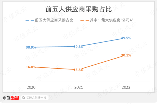 2022年,公司向前五大供应商的合计采购占比为50%,其中向最大供应商“公司A”的采购占比为30%。