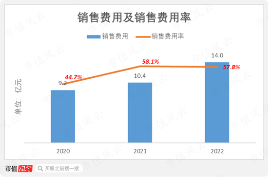 销售费用一直是公司最大的期间开支,并自2021年以来明显扩大。2021-2022年,公司销售费用率维持在58%左右。