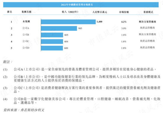 按收入计,2022年,体重管理行业前五大参与者的合计市场份额为12.6%。其中,公司以4.2%的份额排名第一。
