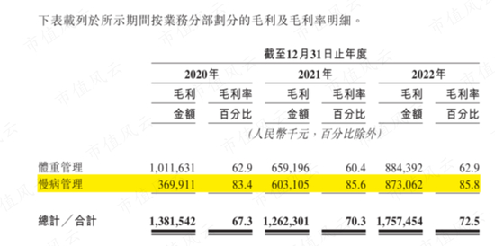 慢病管理业务的毛利率甚至比体重管理业务更高。
