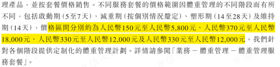 比如,公司将套餐分别启动期、减重期、塑型期和维持期。在启动期,套餐价格介于150-5800元,而到了后三个时期,套餐价格上限可高达1.8万元。