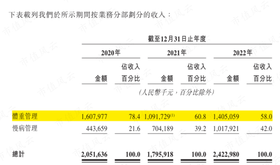 体重管理是公司最为核心的业务,营收占比虽然自2017年推出慢病管理业务以来逐渐下滑,但2022年仍高达58%。