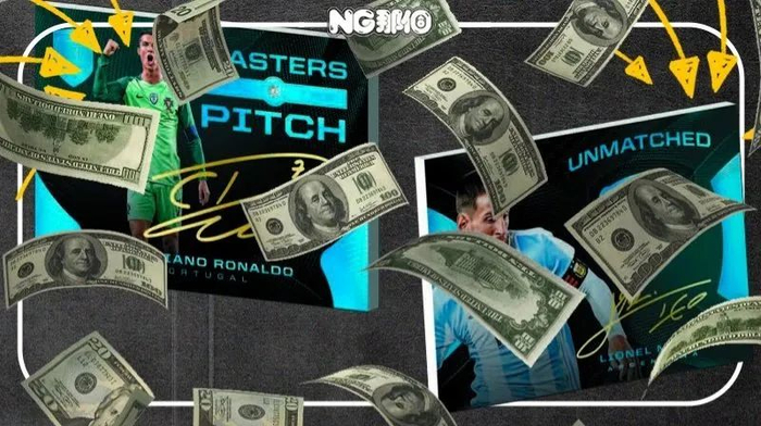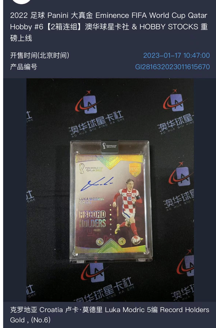 更夸张的是Panini出品的大真金系列,2022年世界杯出的足球大真金,目前在市场上17万左右,里面最高限量10张,张张超过千元,要是开到了梅西,最次也是4.5万左右。