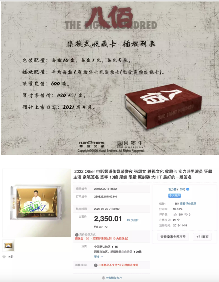 有意思的是,去年电影频道也推出了自己的卡牌收藏,名叫传媒荣誉液(一听就是有赞助商)。虽说名土,但运气好,刚一推出就赶上了《狂飙》热映,里面的张颂文签名卡大受欢迎。
