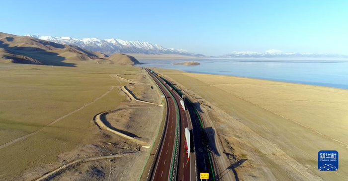 2020年4月24日,寰泰能源一批零部件经过新疆赛里木湖,奔赴哈萨克斯坦科斯塔奈州,用于50兆瓦风电项目建设(无人机照片)。 新华社发