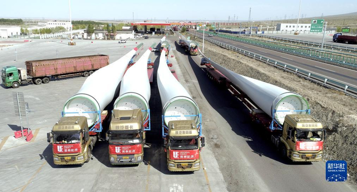 2020年4月23日,寰泰能源一批零部件跨越数千公里,奔赴哈萨克斯坦科斯塔奈州,用于50兆瓦风电项目建设。 新华社发