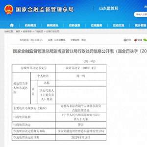 国家金融监督管理总局淄博监管分局发布的行政处罚信息公开表显示,周一鸣对上述“机构非法查询个人储蓄存款”负直接管理责任,被处以警告处罚。作出该项处罚决定的日期为2023年8月18日。该罚单为国家金融监督管理总局淄博监管分局开出的2023年度1号罚单。