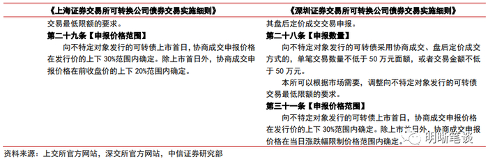 增加了非上市首日的转债涨跌幅限制,并将之前的熔断机制仅放在了上市首日。虽然沪深两个交易所具体规则的表述方式不同,但是实质效果相似,上市首日的涨跌幅均限制在【-43.3%,57.3%】之间,非上市首日涨跌幅限制为20%。