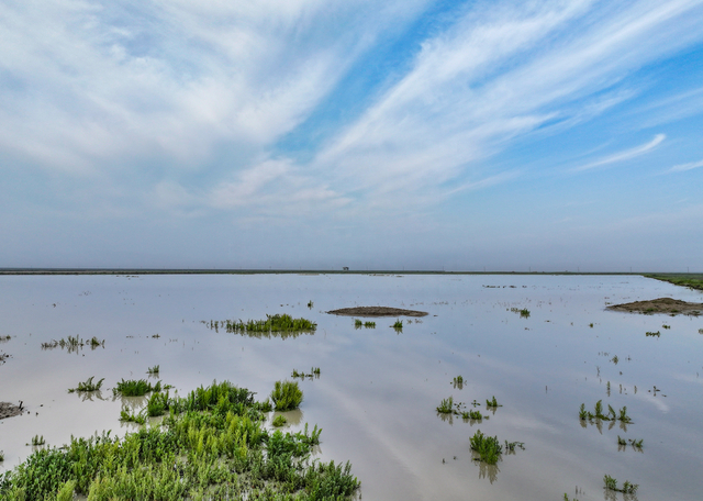 夏秋季节,也是察汗淖尔国家湿地公园雨水丰沛的时节。雨中的湿地则是另一番奇妙景象。站在位于腹地的观海亭之上,远远望去,雨、雾、湖融为一体,绵延百里。一种剪不断、撕不开的厚阔感扑面而来,混着湿漉漉又夹杂着泥土和茵茵绿草的芳香,让人仿佛置身于一幅飘渺诗意、沁人心脾的水墨画中。