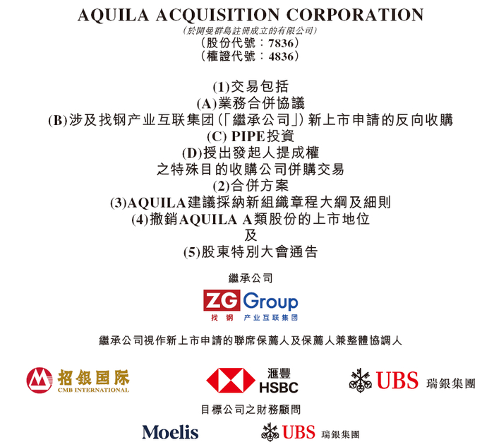 2023年8月31日,找钢产业互联集团 ZG Group(“找钢网)正式向港交所递交有关上市申请,有关AQUILA ACQUISITION CORPORATION(SPAC公司,下称“Aquila”) 特殊目的的收购公司并购交易(De-SPAC)的申请文件。