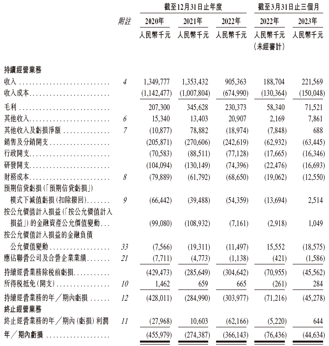根据上市申请文件,在过去的2020年、2021年、2022年及2023年前三个月,找钢网的收入分别为13.498亿、13.534亿、9.054亿和2.216亿元人民币,相应期间的净亏损分别为4.560亿、2.744亿、3.661亿和0.446亿元人民币,相应期间的经调整净亏损分别为2.549亿、1.091亿、2.310亿和0.303亿元人民币。