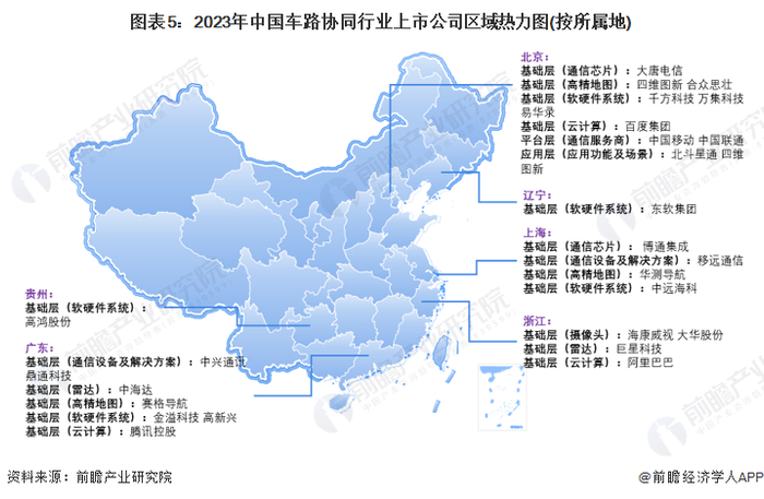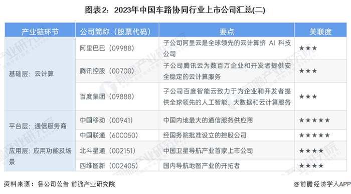 中国车路协同行业吸引了大量的企业参与,包括传统车企、互联网科技公司、通信运营商等。这些企业在技术实力、市场份额、品牌影响力等方面存在差异,形成了竞争格局的多样性。其中基础层主要为设备与终端,主要包括芯片、摄像头、雷达、云计算、高精地图、软件系统等领域,上市企业数量较多,包括阿里巴巴、腾讯、百度、四维图新等企业;平台层主要为平台与运营环节,主要上市企业包括中国移动、中国联通等;应用层主要为应用功能及应用场景,主要上市企业包括北斗星通、四维图新等。