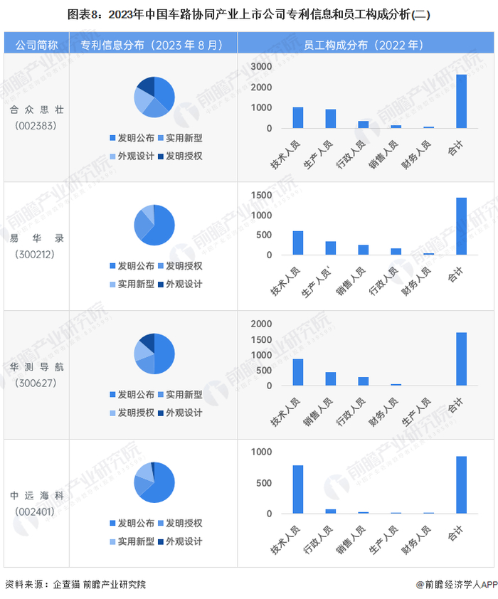 从车路协同行业的上市企业已有的公开信息分析,专利信息相对较多的企业是东软集团(600718),专利数量超过2000条;员工总数较多的企业也是东软集团(600718),员工总数超过10000人。