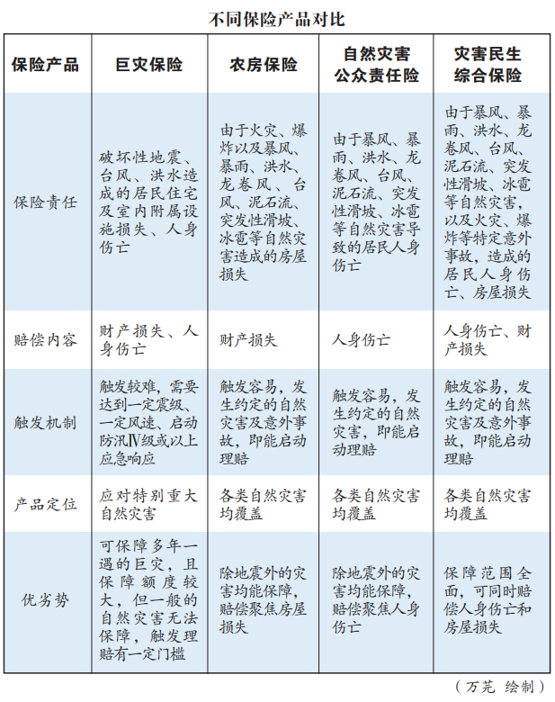 相较于巨灾,小灾更具有普遍性,对群众生产生活的影响更加频繁。相较于农房保险,自然灾害民生保险具有低保额、广覆盖,保障内容全面,责任清晰,启动快等优势,实现了多灾种、多层次的综合保障,有效弥补了原农房保险的短板不足,对其他不具备兜底保障功能的险种起到了补充和完善作用。同时,灾害民生保险属于巨灾保险范围之内、较低保障层次的保险形式,主要聚焦一般性、常规的自然灾害对受灾群众造成的影响,主要保障受灾群众基本生活保障,能够有效帮助受灾群众尽快恢复生产生活,最大限度避免因灾致贫返贫。