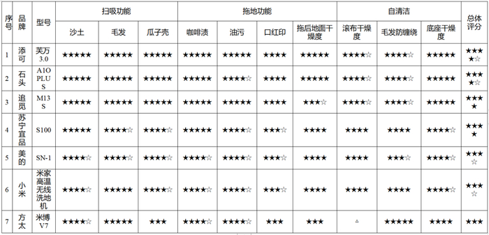 在对咖啡渍、油污、口红印的拖擦及拖后地面干燥度的测试中,7款样品总体表现较好,其中小米牌(型号:全能1S)样品拖后地面干燥度表现不佳。