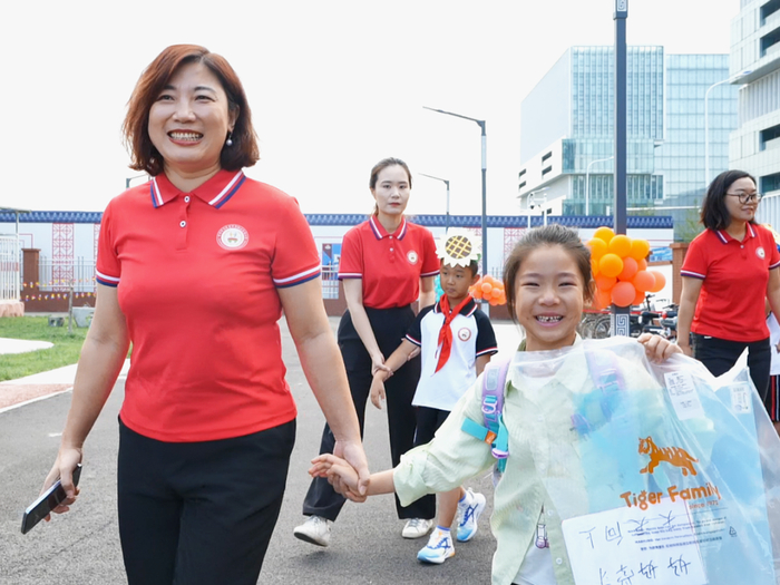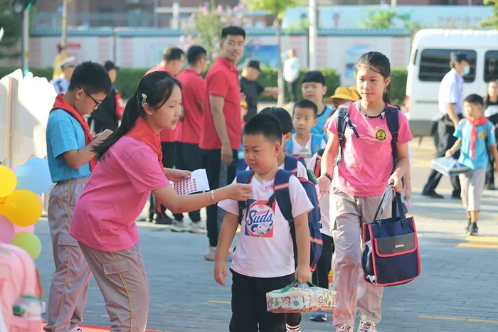 “新学期送你一朵小红花,祝你开学快乐!”记者在黄城根小学顺义分校看到,一年级的萌娃们正在老师和高年级哥哥姐姐的热情迎接中有序走入校门。寂静的校园迎来了阔别已久的同学,欢声笑语再一次回荡在校园里。