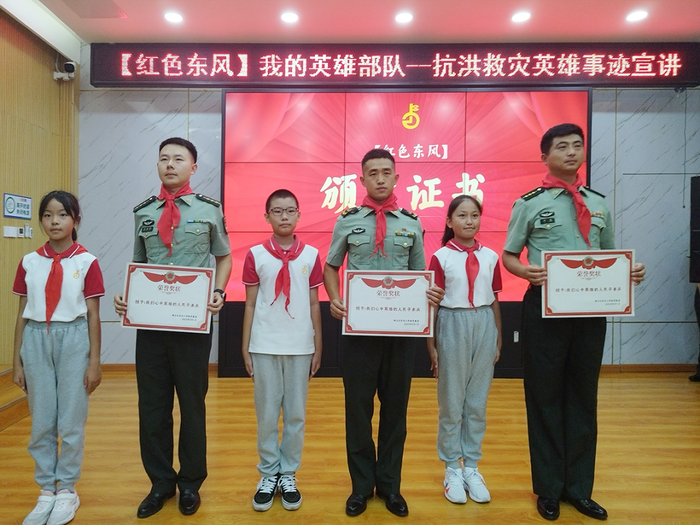 在东风小学教育集团的开学典礼上,少先队员为抗洪救灾英雄送上荣誉奖状。