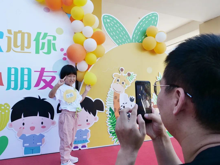 港馨东区幼儿园路劲御和府分园的幼儿家长拍照留念。