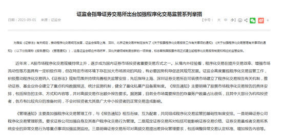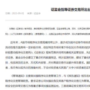 证监会表示,同时发布《管理通知》主要是加强程序化交易管理工作,与《报告通知》相互衔接、互为配套,共同组成程序化交易监管的基础性制度安排。