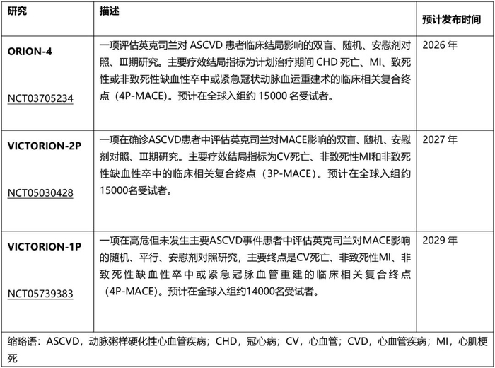 ORION-9、ORION-10和ORION-11研究方案预先指定了探索性终点,收集患者报告的MACE事件。对这3项Ⅲ期研究个体受试者数据的汇总分析共包含3655例患者,结果显示,在研究进行的18个月内,英克司兰组1833例患者,共报告141次MACE事件;安慰剂组1822例患者,共报告201次MACE事件;英克司兰显著降低复合MACE风险25%(HR 0.75,95%CI:0.60~0.94;P=0.013)[8]。该探索性终点分析表明英克司兰降低MACE的潜在获益,目前更大样本的硬终点心血管结局试验(CVOT)正在进行中,包括ORION-4、VICTORION-2P和VICTORION-1P研究(表1)[9-11]。