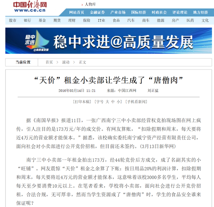 早在2016年,广西南宁三中小卖部经44轮竞价,就拍出了一年租金173万元的天价。