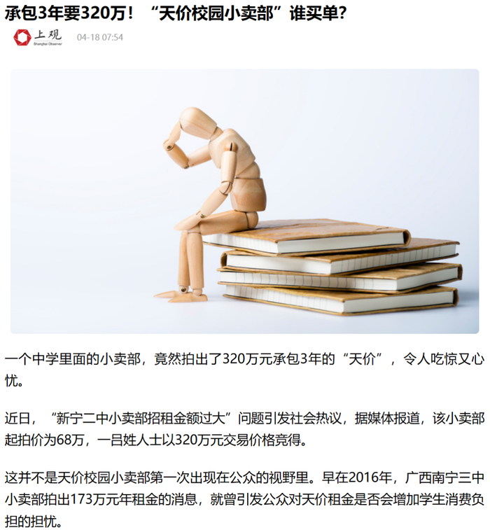 这一年4月,湖南邵阳新宁二中也拍出了3年承包权320万元的价格。不过这个拍卖因为网上非议太大,被暂停了。