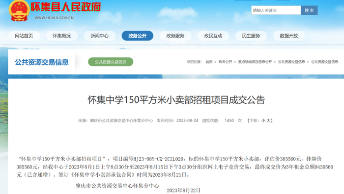 这是出让价,而怀集中学小卖部拍卖所得900多万只是5年的租金。换算一下,一年租金是180多万,月租大概是15万多。