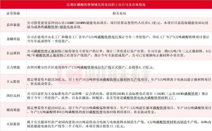 不过值得注意的是,产能过剩也没能阻止企业继续扩产的步伐。据财联社不完全统计,多家A股上市公司近期投产磷酸铁锂项目,包括嘉泽新能、龙蟠科技、长远锂科、天力锂能、丰元股份、国轩高科、湖南裕能和天原股份等,具体情况如下: