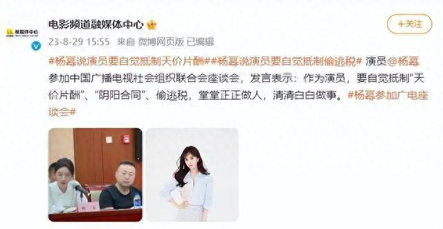 据@电影频道融媒体中心 微博消息,演员杨幂参加中国广播电视社会组织联合会座谈会时表示,作为演员,要自觉抵制“天价片酬”“阴阳合同”、偷逃税,堂堂正正做人,清清白白做事。