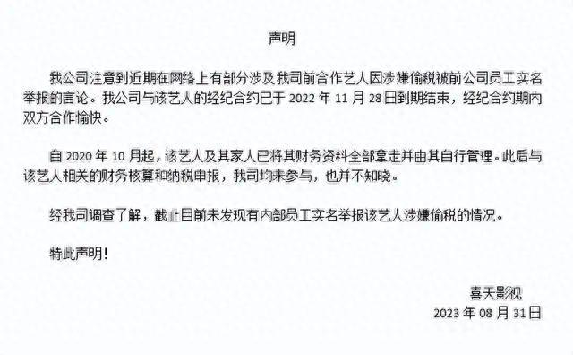 8月31日中午,宋祖儿前经纪公司喜天影视发布声明,称与宋祖儿经纪合约已于2022年11月28日到期。自2020年10月起,宋祖儿及家人已将财务资料全部拿走并自行管理,此后未参与相关财务核算和纳税申报。声明还称经调查了解,未发现有内部员工实名举报宋祖儿涉嫌偷税的情况。