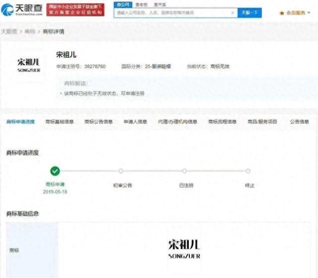 天眼查App显示,抢注宋祖儿商标均被驳回,自然人罗某和苏州某纺织科技公司曾于2019年、2020年申请20余枚“宋祖儿”商标,国际分类包括服装鞋帽、家具、广告销售等。目前,这些商标均已被驳回或处于无效状态。