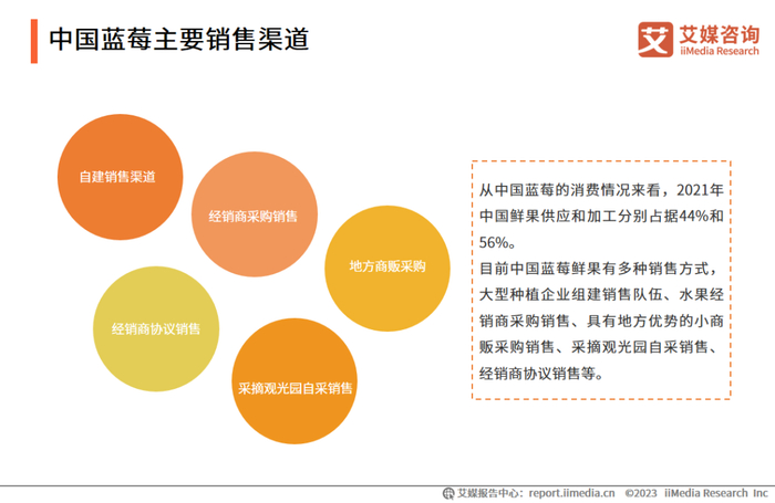 数据显示,中国蓝莓加工消费市场大于鲜果消费市场,且超过50%。由于蓝莓具有较高的营养价值和清爽的口感,新式蓝莓茶饮、果汁等加工产品受到年轻群体的广泛喜爱。随着中国蓝莓消费市场的扩大,以及人们对于茶饮、果汁、保健品需求量的增加,未来中国蓝莓加工市场将进入快速发展阶段。