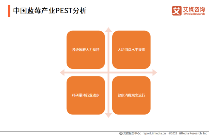 国家战略引导、省部级政策扶持、科研院所的技术支持、地方招商引资优惠政策等全方位的扶持使大量优质的人才、科技和资本有序地注入到蓝莓产业中,推动了中国近年来蓝莓产业的快速发展。健康的消费理念和生活方式以及人均消费水平的提高,为蓝莓产业提供了广阔的发展市场和前景。