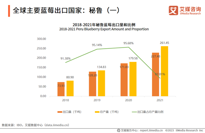 数据显示,由于国内市场需求量较小,秘鲁蓝莓主要用于出口,2018-2021年平均每年出口量占总产量的比例高达92.30%;2021年秘鲁蓝莓出口占总产量的比例为87.01%,较2020年最高点的95.68%略有下降。由于2019年智利水危机影响,秘鲁把握时机以128.28千吨的出口量超越智利成为世界上领先的蓝莓出口国家,并且接下来的几年出口量不断提高,2021年达到227.48千吨,同比增长32.39%,超越国内新鲜牛油果出口量,成为国内排名仅次于新鲜葡萄的果蔬类出口产品,并连续三年巩固了其作为全球领先的新鲜蓝莓出口国的地位。