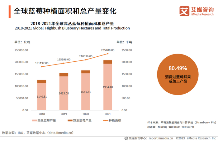 iiMedia Research(艾媒咨询)数据显示,近一年来中国年轻群体中(18-35岁)约80%的人消费过蓝莓相关产品(包括鲜果和加工产品)。世界范围内蓝莓的消费人数和消费数量也在不断增长,为满足消费需求,全球蓝莓种植面积(主要是高丛蓝莓)和产量(含种植类和野生类)在不断增高,2021年分别达到235408.00公顷和1934.40千吨,其中高丛蓝莓产量远高于野生蓝莓产量。
