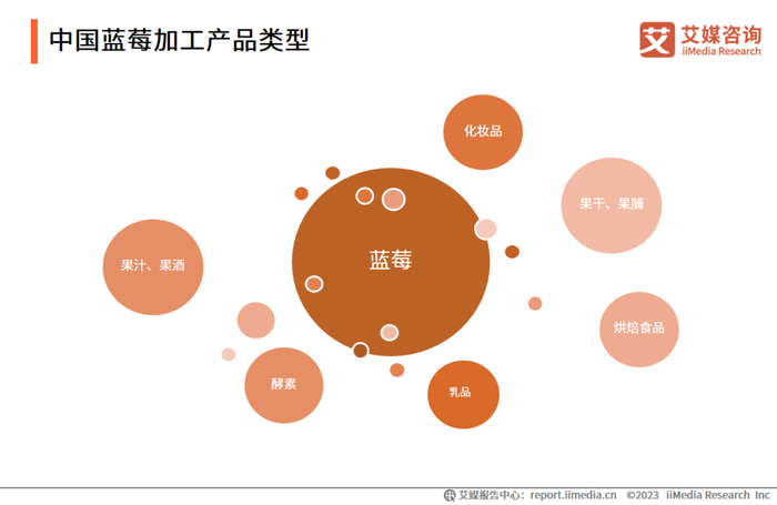 中国市场上,蓝莓加工产品类型比较丰富,主要包括果汁饮料、果酒、果酱、果干、果脯、果粉、果片、乳品、烘焙食品、酵素和糖果以及蓝莓相关化妆品,在数量与种类方面日趋与国际接轨。