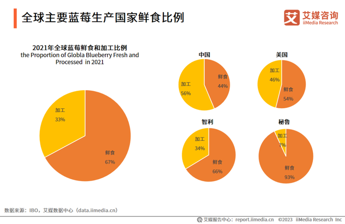 数据显示,2021年全球蓝莓鲜食比例为67%,约为加工的2倍,鲜食是蓝莓在全球的主要食用形式;而中国蓝莓加工的比例则高于鲜食比例12个百分点。秘鲁和智利作为世界上主要的蓝莓出口国,在鲜食比例上分别高达93%和66%。中国由于优质蓝莓品种较少,蓝莓鲜果的品质较低,采摘的蓝莓很大比例上用于深加工成果汁、果酒等产品。