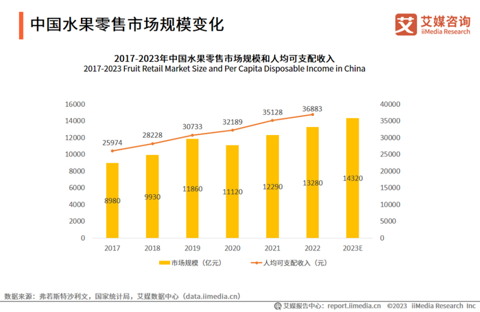 数据显示,2017-2022年中国水果零售市场规模和人均收入不断增长,2022年中国水果零售市场规模达13280亿,预计2023年达14320亿,2022年中国人均可支配收入为36883元。艾媒咨询分析师认为,随着中国人均可支配收入的增加,人们对于新鲜水果的消费意愿将会增强;同时随着中国物流运输配送能力的增强,水果可以更加方便地运送到消费者手中,未来中国水果零售市场规模还将继续扩大。