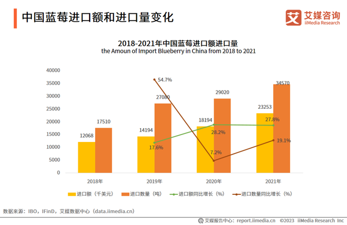 数据显示,自2016年中国进口蓝莓金额突破1千万美元以来,中国进口蓝莓的数量和金额不断扩大。2021年中国进口蓝莓的数量为34570吨,同比增长19.1%,进口金额突破2千万美元,同比增长约27.8%。艾媒咨询分析师认为,后疫情时代,随着人们健康饮食观念的提升,以及收入水平的提高,未来中国蓝莓进口市场有望继续扩大。