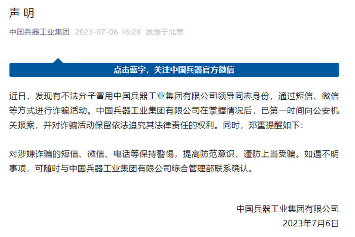 今年7月6日,中国兵器工业集团曾发布声明称,近日,有不法分子冒用中国兵器工业集团有限公司领导同志身份,通过短信、微信等方式进行诈骗活动。中国兵器工业集团有限公司表示,在掌握情况后,已第一时间向公安机关报案,并对诈骗活动保留依法追究其法律责任的权利。