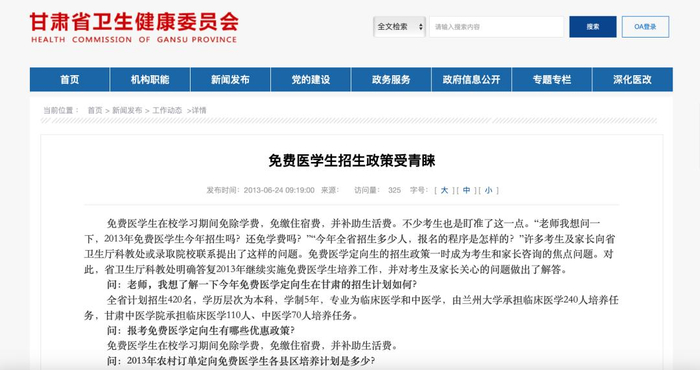 另据澎湃新闻此前报道,甘肃方面也承认,由于定向医学生违约成本较低,加之部分市州、县市区在定向医学生就业安置、落实岗位、待遇等方面工作不到位等原因,一些定向医学生毕业后选择违约,影响政策效能。